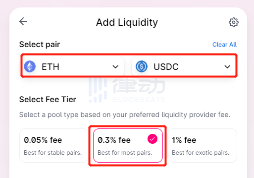 1. 选择在 ETH/USDC 资金池提供流动性,费率就选择资金规模最大的 0.3% 即可。