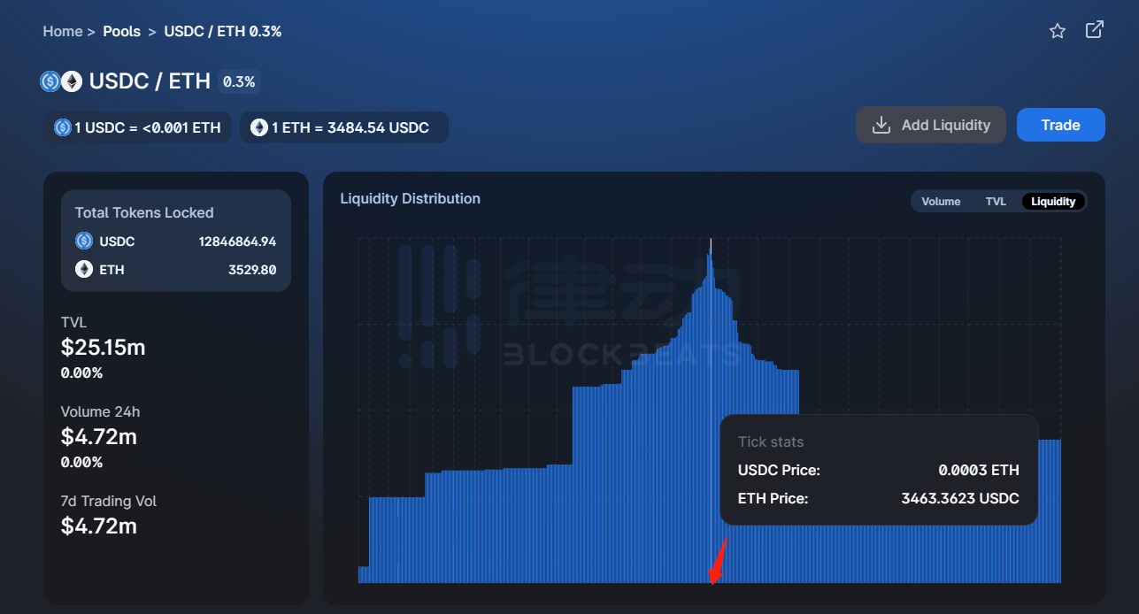 这个页面展示了资金池的流动性,在不同价格区间的分布情况。我们将鼠标移到箭头处的曲线最高点位置。可以看出,目前在 3463.3623USDC/ETH 的价格点内,流动性最为集中。这与当天的 ETH 价格也高度相关,可以看出,LP 在当天的现货价格附近提供了最多的流动性,也意味着交易者在这个价格点附近交易,可以享受到更低的滑点。
