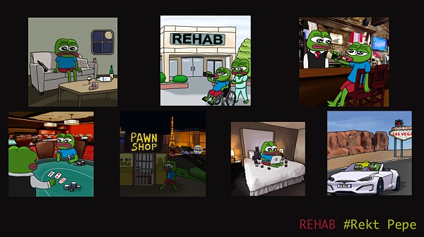Rehab 是 rehabilitatio 的缩写,意即(吸或酗酒)康复治疗中心,取此名寓意为逃离乌烟瘴气币圈文化(手动狗头 .jpg),可以理解为炒币党理疗中心,并以此作为叙事线索,出品了「Rekt Pepe」等系列的 Meme NFT。