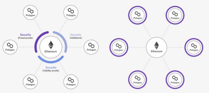Polygon 是 Matic 网络的升级产品,与 Matic 成为两个不同的扩容解决方案。Matic 使用了 Plasma 框架,来保证侧链的去中心化和安全性。Matic 在 Plasma 链中应用了基于账户的模型,不同于其他 Plasma 中的 UTXO 系统,这让 Plasma Matic 适用于以太坊系统,支持 EVM。Plasma 侧链使用 PoS 共识机制,质押 Matic 代币可以成为网络中的验证者。Polygon 的独立侧链完全与以太坊适配,因此用户和开发者的学习成本为零,通过桥链接支持互操作性,侧链中有独立的验证者保证安全。Polygon (Matic)目前上线了侧链和 Plasma 两个以太坊扩容方式, ZK Rollup 和 Optimistic Rollup 产品在未来的规划中。这是为了实现不同用户的扩容需求,例如企业级应用、初创公司和专注网络安全的公司等。Aavegotchi、Easyfi、SportX、Aave 等应用使用了 Polygon 的架构。