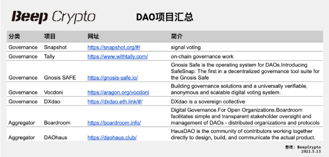 总结来看,本质上,任何具有 DAO 治理和管理的自治组织都可以称为 DAO,所以 DAO 更像是一个「可组合模块」渗透到各类项目当中去,这类生态组成在此定义为「DAO Adaptor」,其中大家熟悉的项目包括 Uniswap,MakerDAO,AAVE,Compound,YFI,Aavegotchi,Decentraland 等都是 DAO 组织的先行者。