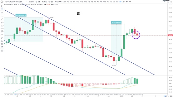 周线上,前期1月初在减产币整体强涨行情的带动下,强势突破19年顶点188美元拐头回落的维持190天时间的周线下降趋势通道压制,扭转了弱势局面,成交量显著增强,周线MACD指标线水下金叉向上,绿柱逐步增长,上涨动能进一步增强,价格直线向上拉升,并突破周线布林中轨,最高向上插针至150美元阶段顶点,价格从突破点50美元涨至最高点,不到两周时间区间涨幅将近200%,整体盘面走势相当强势。