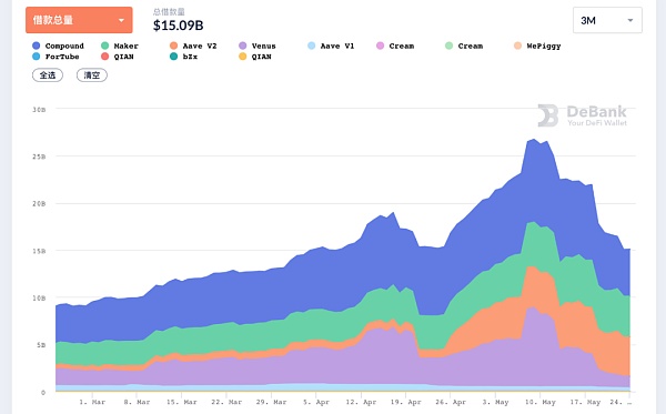 ?其实,市场在 5 月 19 日开始已经出现大幅调整,在这种极端的压力测试下,又是一个可以很好的观察 DeFi (去中心化金融)体系运转效率的机会——特别是当这个系统的参与资金量一度突破了 1000 亿美元的里程碑,其中部分资产还在进行超额质押或者执行杠杆类的交易。