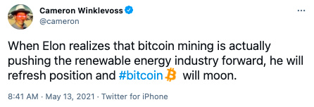 而 Gemini 联合创始人、比特币亿万富翁 Cameron Winklevoss 并不认可马斯克和特斯拉关于比特币挖矿的看法。?他认为比特币挖矿实际上在推动可再生能源行业发展。“当埃隆(马斯克)意识到比特币挖矿实际上正在推动可再生能源行业向前发展时,他将重新定位,比特币将飙涨。”