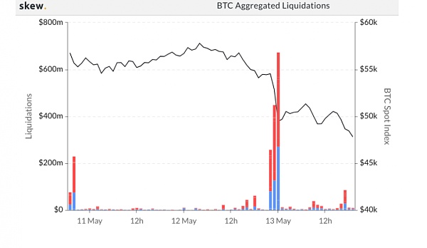 Skew的数据还表明,在过去的24小时内,期货市场发生了大量的清算,在5月13日北京时间上午6点左右,最高清算了4亿多美元。