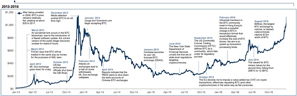 下图为比特币自2013-2016年、2017-2021年的价格波动轨迹及重要时间节点: