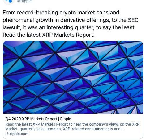 Ripple发布2020年第四季度?XRP?市场季度报告。该文件提到,在第四季度,Ripple向市场参与者净卖出的XRPOTC交易额翻了一番,以维持XRP的流动性。此外,相比?2020年第三季度,XRP全球交易量在第四季度猛增299%,达到1481.5亿美元。日均成交量从第三季度的4.0358亿美元飙涨至第四季度的16.1025亿美元。