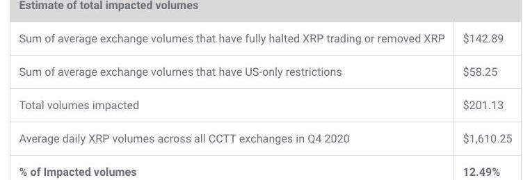 CCTT名单中的交易所有8家对XRP采取了某种限制性行动。其中一半的交易所选择完全停止或取消XRP在其平台上的交易,而另一半则选择仅针对美国地区进行限制。Ripple报告指出,预计第四季度约12.49%的XRP交易量受到影响。