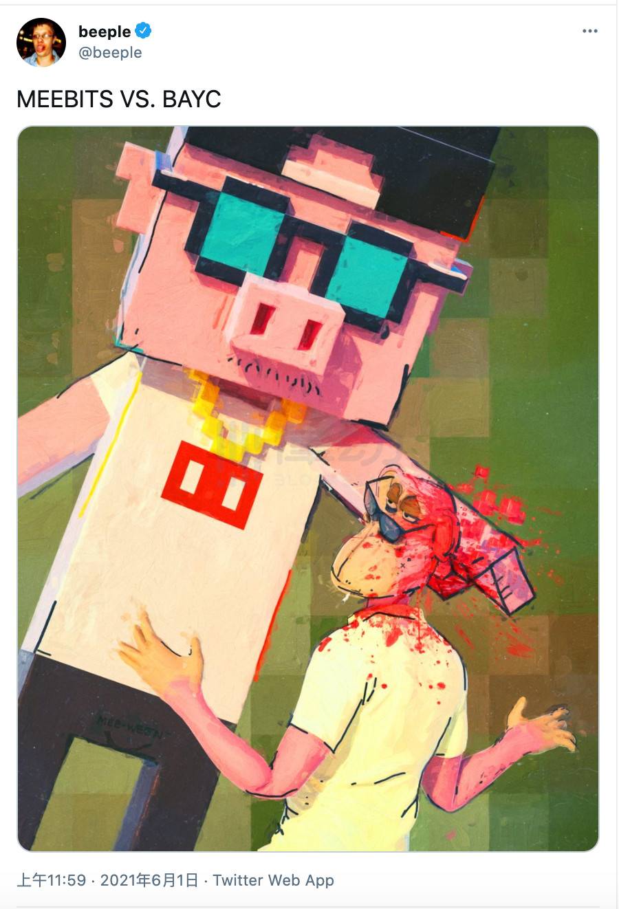 而著名加密艺术家、每天创作一幅作品的 Beeple 自然也不会放过这个热点事件,他先是创作了《MEEBITS VS. BAYC》,描绘了一只 Meebits 击败一只猿猴的画面,而当这幅作品被发布出来后,立刻遭到了大量的批评与吐槽,猿猴们的持有者纷纷表达了对 Beeple 作品的不满。