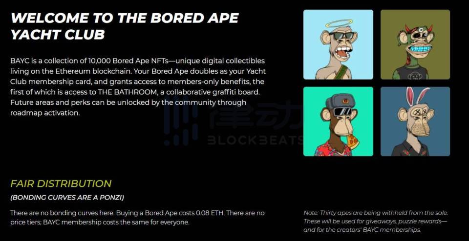 时间来到 5 月 1 日,「蓄谋已久」的无聊猿猴 NFT 正式发售。与当时几乎所有 NFT 项目发售都不同的是,Bored Ape Yacht Club NFT 的发售并没有采用联合曲线的形式,而是将 1 万枚 NFT 全部定价 0.08ETH,更有趣的是,在发售页面赫然写着:「联合曲线是庞氏局(BONDING CURVES ARE A PONZI)。」在 Bored Ape Yacht Club 团队看来,给每一只猿猴都定价 0.08ETH 是促进社区成员公平、平等的最好方式。