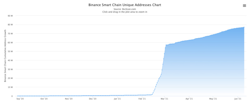 BSCScan 图表可以清晰的看出,经历了二、三月份的大爆发,BSC 网络的独立地址数量已进入了平稳增长阶段,4 月 9 日,BSC 网络的独立地址数量为 64202561 个,6 月 9 日数据为 76998164 个,区间增幅为 19.93%。?