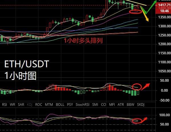 1、日线图ETH长上影线压力,倒T线暂时还未收盘,但短期高位出现多头获利了结,低开于1450下方,行情短线承压双针顶部压力,后市关注低位企稳再进场看涨。