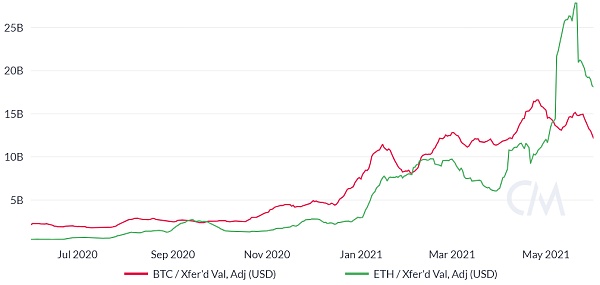 比特币和以太坊的链上交易和转账金额也存在类似现象。根据该指标,以太坊表现出了显著的优势。