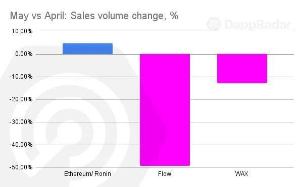 5月份,NFT交易市场的销售量下降了5%。这是成交量连续第二个月下降。减少的主要原因是Flow和Wax。Flow只带来了3500万美元的销售额,比4月份减少了50%。围绕着NBA Top Shot的活动正在减少,因为该平台正在努力改善包装销售和用户体验。尽管有许多举措,但 NBA Top Shot 仍难以回到 2 月份的高度,并面临着负面趋势。