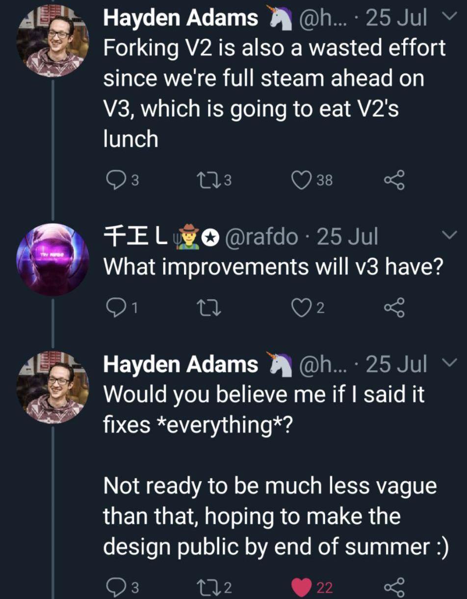所有这些改进都会令V3在技术上非常复杂,HaydenAdams认为这样会使分叉更加困难,从而对Uniswap有利。因为更多的流动性将留在其平台上,而不是转移到其他“克隆平台”中。