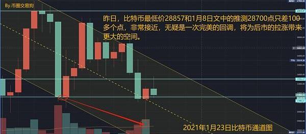 昨日,比特币发生巨幅下跌,最低价收于28857附近,这个点位刚好和1月8日我们文章中的点位如出一辙。