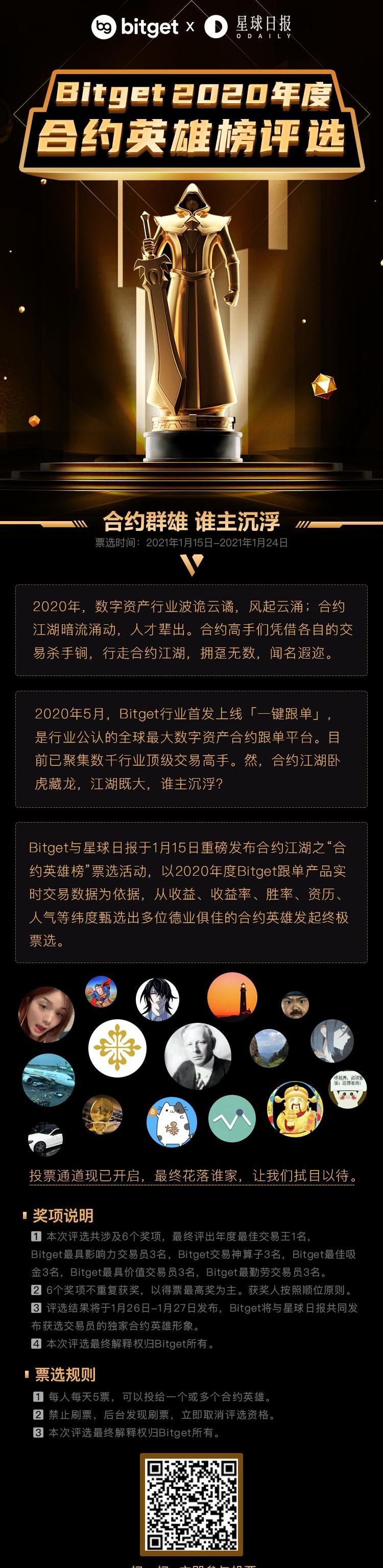 Bitget?与Odaily星球日报于?1月15日发起江湖招募令,广发英雄帖,重磅开启合约江湖之“合约英雄榜”票选。榜单已启,票无虚发,江湖看客莫荣错过。英雄榜的评定,将依据?2020?年度Bitget跟单产品交易数据,从收益、收益率、胜率、资历、人气等维度甄选出多位德业俱佳的合约英雄,在之后的终极票选中,将助其登上“合约英雄榜”。