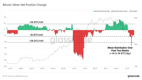 矿工持仓净额变化指标显示了矿工未使用的供应30天的变化率。这表明在过去的两周里,分发量明显增加,通常与哈希率的整体下降相吻合。在过去的两周里,矿工们以每月约4千到5千的速度净分发。这已经扭转了自4月以来净积累的趋势。