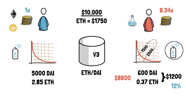 如上图,如果你只有1000 美元的资金量,在传统V2 中只能是1000 美元资金做市,按池子占比获取手续费收益。但在V3 中,你可以用风险(波动率)换取杠杆(资本效率),例如选择蓝色策略,即将1000 美元聚集在当前汇率点前后50% 波动范围内,你将获取4 倍的资金效率,相当于在这个区间范围内拥有了4000 美元做市;选择紫色策略,将1000 美元聚集在当前汇率点前后1% 波动范围内,你可以获取175 倍的杠杆,相当于17.5万美元做市。这是非常恐怖的,似乎可以说这跟在中心化交易所里梭哈自己的一部分资金百倍做多或做空的性质一样,而官方也给出了一个4000 倍资本效率的最高值。