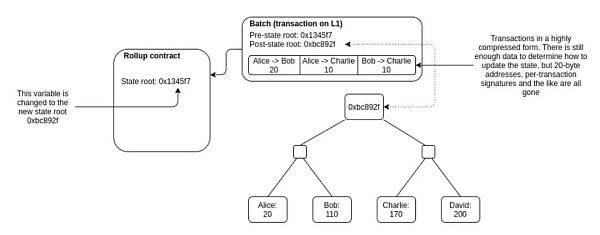 在链下计算压缩每批的交易数据,并将压缩计算得到的状态根传回rollups上。