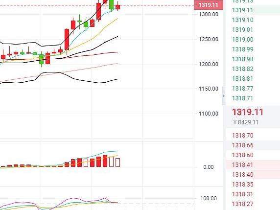 而目前的短线行情趋势中我们可以看到,行情继续向上进行突破,目前短线的行情下方支撑依旧是MA5的支撑位,行情依托这个位置进行一路的支撑上行,大趋势依旧是看涨,这一点也是没有问题的,而且附图指标MACD与KDJ的走势中我们可以看到,目前这两项指标处于高位的状态中,行情继续拉伸,还需要一个蓄力之后,才能继续向上进行突破,下方的支撑位我们可以看到1310-1315一线的支撑位,回调下方的支撑可以继续进行多单的进场,把握好短线,行情突破再继续看!
