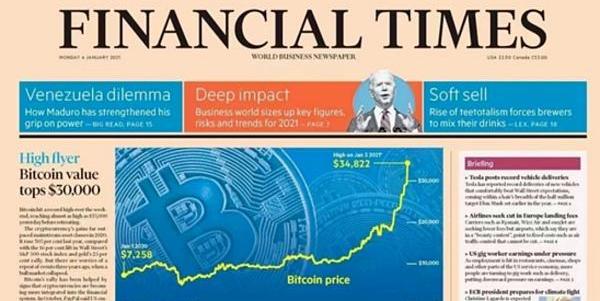 而国内媒体也开始大范围对比特币价格频频进行报道、英国《金融时报》甚至公开在头版头条对比特币突破35000美元进行报道……