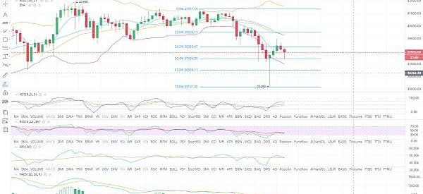 短周期小时图看,布林带呈开口姿态,行情回踩35200位置后,价格走出3000多点的强势反弹,目走势重回布林带轨道之内,上方压制在39000位置。短期走势触及反弹节奏中,后续若是价格突破39000位置,行情有进一步向上试探40000一线的可能,所以破位可以尝试轻仓追涨。上方压制先关注39000/38000,其次看40000一线,下方支撑关注36500-37000区域,其次看36000一线。