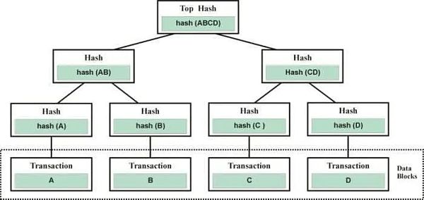 给定区块中的每个交易对应于Merkle树中的一个叶子,通过哈希单个交易递归构建Merkle根。