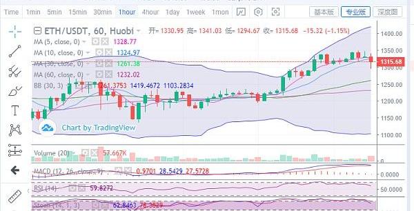 以太坊日内破位上行再创新高,价格向上试探打破1288-1300-1340重重阻力,高位触及1350一线受阻回调。后续上攻力度不强,并未打破1350一线压制,行情也是承压走出回调,价格下行试探1300一线支撑前度。目前价格在1326位置附近运行,多头情绪浓重,整体有望价格进一步向上试探,再度破位有点刷新历史高点的可能。