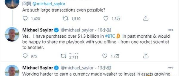 随后马斯克回复问道:“这么大的交易有可能实现吗?”塞勒则回应称:“是的,在过去几个月中,我已经购买了价值超13亿美元的比特币,我很愿意在线下与你分享我的经验。”