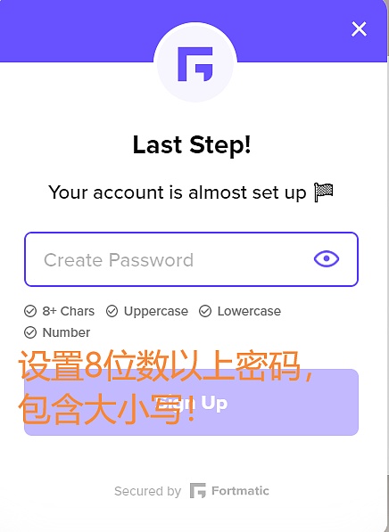 7.最后一步设置一个登录密码(必须是8位以上大写字母,小写字母以及数字的组合),条件正确会显示“Sign up”,点击并在数字签名确认页点“Confirm”确认。