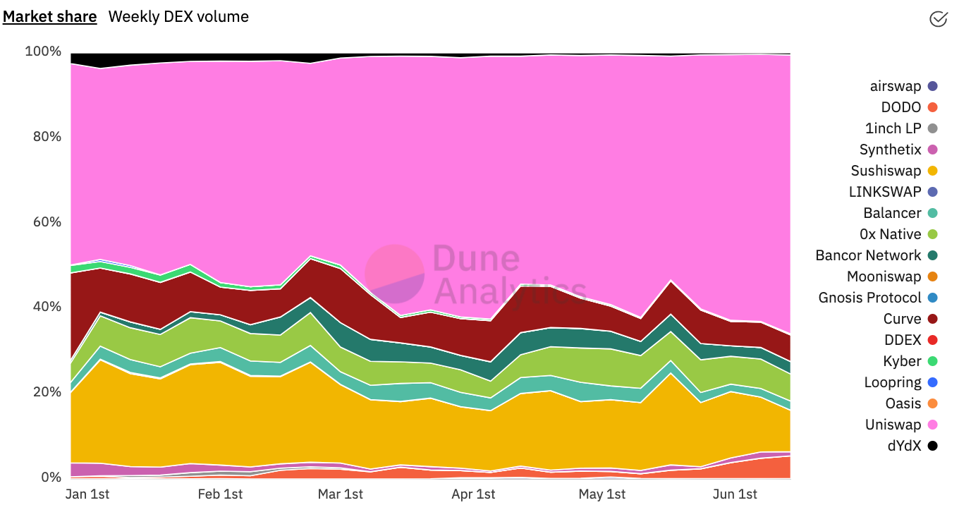但你猜怎么着?Uniswap仍然是DEX领域的主导力量,没有其他协议能够接近其产生的交易量和费用,这从其60%以上的市场占有率以及年初至今三位数的增长率可见一斑。