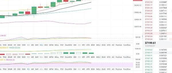 比特币一小时图上看,大饼价格一路拉高,午间最高涨至37660附近一带,再次打破历史记录,K线价格位于五日均线上方呈多头排列,多单趋势依旧强势,五日均线与十日均线继续向上,布林通道呈开口趋势,指标上MACD快慢线保持在量能柱上方一带行走,且量能柱有放量迹象,但KDJ三线以形成粘合有向下迹象,午间行情极有可能会出现回落。操作上建议以回踩做多为主。