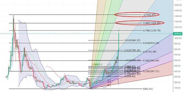 以太坊情况和比特币一样,前面我们给出765-785区域后,这里也是形成过一次压制后被突破,而目前以太坊价格在1080附近,和比特币不同的一点在于,以太坊上方还存在更高点,那么这也就给到了我们更多的信息。