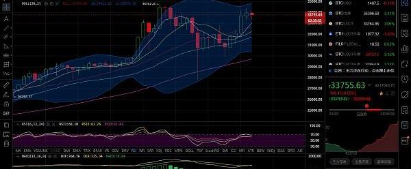 比特币昨日走了一波冲高回落,高位触及32833附近,日内价格自凌晨开盘32091位置不断向上攀升,上拉2500余点,高位触及34373位置承压回调,目前币价在33800附近。