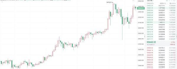大家早上好,比特币经过昨日白盘的三千点左右的多空拉锯战,夜间多头逐步回暖,并有效的企稳在32200一线,行情如期上行,并一路上攻至33000-34000一线,并在早间六点钟左右价格最高上行至34372附近,随后震荡回落当前价格运行在33500附近,根据昨日李斌所说进场币友,本次多单耐心持有等待行情刷新历史新高,但是大家还是优先把握咱们当前手中利润,避免流失,从四小时K线图中来看:当前布林带通道呈现出上行有拐头向下的迹象,K线价格运行在布林带中上轨道内运行,MACD多头量能正逐步放量,MACD快慢线在零轴上方呈现粘合走平姿态运行,KDJ在50水平线上方超买区呈现出交叉上行有拐头向下的迹象,RSI在50水平线上方强势区呈现出交叉有拐头向下的迹象运行!