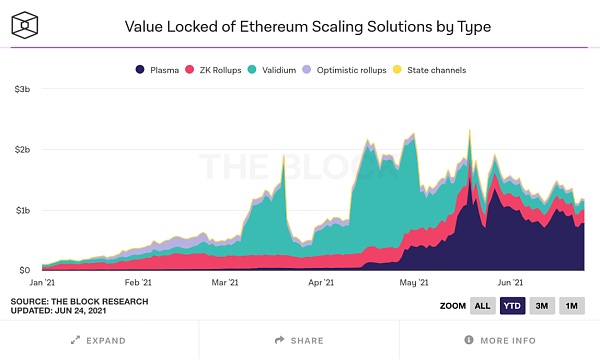 2021第一季度以ZK Rollups领头,Validium紧随其后。第二季度Validium首先爆发,随后Plasma崛起占据主导。