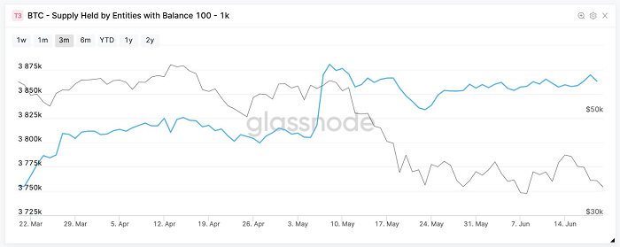 尽管比特币市场进行了大规模清算和现货抛售,但在这段时间里持有 100 到 1000 枚比特币的人反而开始囤积实际上积累了大量 BTC,如下图所示: