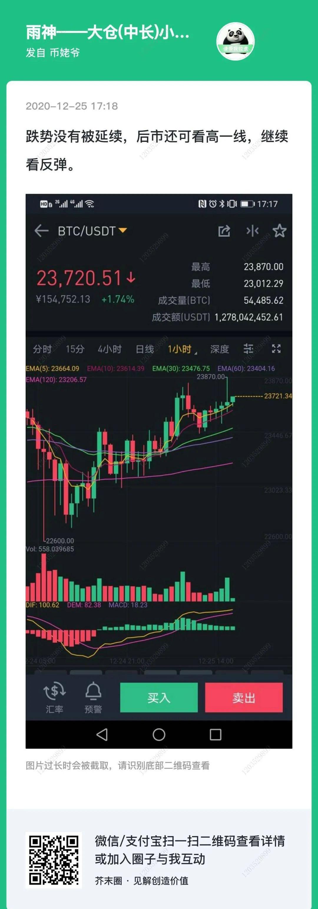 ?????BTC:日线级别的三角区间已经突破,价格也在5日线上方,支撑边界大概在24000附近,此位置不破,大饼的主升浪行情就不会结束,甚至有机会在年前拔的更高。从小时线来看,大饼这种斜率的涨势无法长时间维持,预计会在25000左右进行一个横向整理,即便有回撤也只是为了接下来更好的突破。长牛行情,如果不擅长做波段,那就继续持有即可。?ETH:小时级别回踩MA30均线,收线后依然位于线上,短期继续看涨。?LTC:近期的龙头,月线圆弧底形态接近完成,接下来的目标145,中期行情看好突破并继续拉升。?BCH:月、周线都没明显向上拐头迹象,想买的朋友等突破形态走出来再买也不迟,更加安全而且大部分的涨幅也都是在突破形态之后走出来的。?EOS:反弹不力,弱者恒弱。?XRP:这么高的跌幅交易量,不是单靠散户就能砸出来的,反弹也是为了更好的下跌。这是一个羊毛与投资策略并存的圈子~