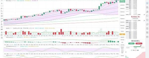 1D:持续了一个星期的震荡,在昨天被强势突破,比特币在突破上方压力23830之后,接下来的一个小时的时间内最高冲击到了24700的历史新高的位置,随后几个小时又有一波千点回调.