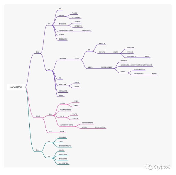 可以看出,整个系统高度依赖于平台代币的运转,通过设计代币多通道流入流出路径,利用代币转移加深创作者和粉丝之间的捆绑关系。对于创作者,ROCKI设置了作品收入、广告流收入,虽然引入质押等玩法,本质上质押收益的多少取决于创作者的创作水平。
