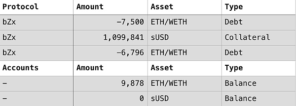 在这一步之后,使得 sUSD 价格被抬高了 1.5 倍,攻击者手里的资产还是正常与 KyberNetwork 交互,并没有实质性的攻击发生。然而,KybrNetwork 内部通过 Uniswap 完成 sUSD 与 ETH 转换,这使得那些将 Uniswap 作为 sUSD/ETH Oracle 的其它平台(比如说 bZx)误认为当前 sUSD 价格的确有这么高,这才触发了后面的攻击事件。此时,系统的资产如下: