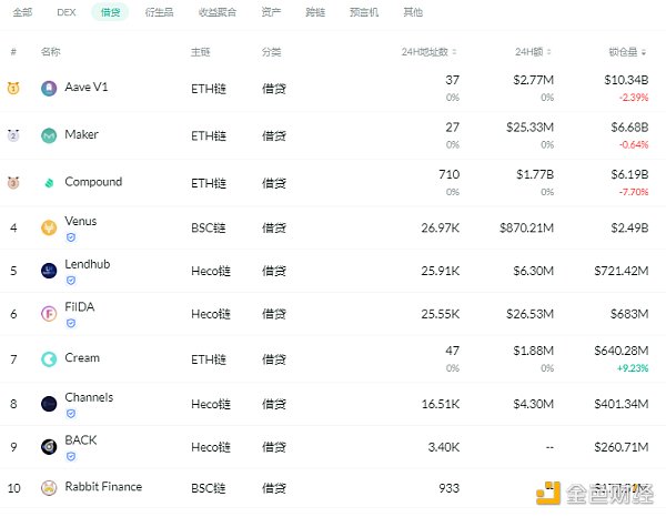 锁仓量排名前十的借贷平台 排名来源:DeFibox