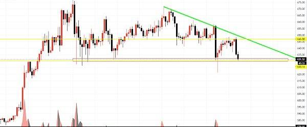 而高位的下压趋势线也十分明显,多次的抛压,且抛压点不断在下移,若日内能站稳630下方,托底力量减缓,多空对冲不足,那么以太于晚间大概率跌破620,试探短级别新低。