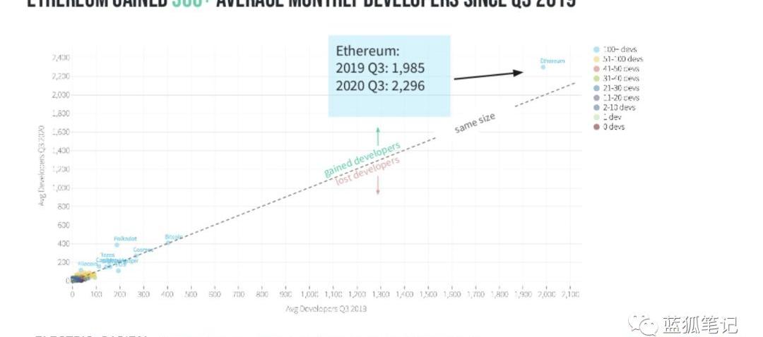 以太坊生态最活跃,跟三年前相比,其月度活跃开发者增长超过215%。从2019年Q3以来,以太坊月度获得300+开发者。