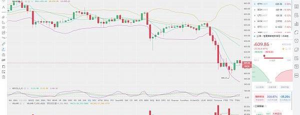 ETH行情分析:小时图分析,以太今天是震荡向下。午间4点放量下跌。晚间8点最低来到595附近遇支撑后反弹,目前K线来到610附近运行。技术上布林带向下开口加大,K线跌破下轨线后回到通道内运行。幅图KDJ三线向上开口。MACD快慢线在0轴线下方形成死叉,空头量能柱缩短。VOLUME成交量放大。综合各个技术指标看,短期反弹继续看空