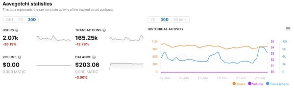 Aavegotchi去年3月从以太坊切换到Polygon,显示出积极的结果。尽管与3月份的峰值相比,唯一活跃钱包数量下降了22.45%,但下一个扩展将是Gotchiverse Realm的推出,这是一个数字元宇宙世界。随着额外游戏机制的增加,比如迷你游戏,预计像素化的鬼魂会在未来几个月吸引更多用户。