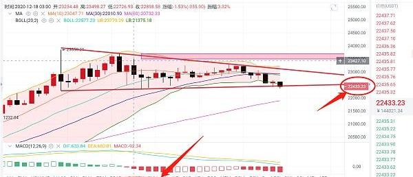 短周期小时图上看,布林带缩口走缓,币价在中下轨运行,MA10均线下穿MA30呈死叉下行,价格上行力度开始减弱,受阻于上方30日均线23000位置,若后续不能上行突破此位,则行情会进一步下探22000位置。附图指标MACD快慢线在零轴上方走缓,量能持续衰弱。晚间操作上建议高空为主。