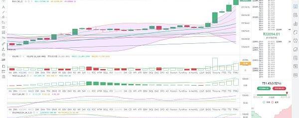 ????????日线看布林带开口扩大向上运行,昨日大阳收尾,币价突破布林带上轨最高打到22000上方,目前币价在布林带上方运行,并且不断上探,各均线拐头向上呈现上攻姿态。附图指标中,MACD快慢线在0轴上方拐头形成金叉向上发散,绿色量柱持续放量,KDJ三线拐头向上粘合,StochRSI指标在超卖区形成金叉持续向上发散到超买区附近。