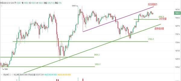 如图所示,昨日午盘后币价出现一轮小幅调整行情,最终没有跌破我们昨晚提示的18960一线短期强弱分界线,这说明自12月11日以来的反弹行情格局没有破坏。不过从上涨的强度和成交量持续萎缩的状态也可以看出,市场当前主动买盘力量并不充足,从走势结构看主因是币价处在高位盘整区上沿附近,市场担心再出现前几次的冲高回落行情,所以不敢轻易发动大规模进攻。既然走势结构没有发生明显变化,接下来短期支撑依然应该重点关注18960,破位则关注趋势线支撑,阻力关注图中反压线附近。